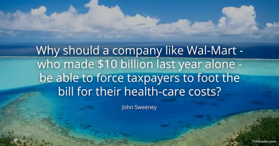 Sweeney, John. "Why should a company like Wal-Mart - who made $10 billion last year alone - be able to force taxpayers to foot the bill for their health-care costs?" FixQuotes. January 17, 2026. https://fixquotes.com/quotes/why-should-a-company-like-wal-mart-who-made-10-79858/.
