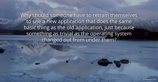 Zawinski, Jamie. "Why should someone have to retrain themselves to use a new application that does the same basic thing as the old application, just because something as trivial as the operating system changed out from under them?" FixQuotes. January 16, 2026. https://fixquotes.com/quotes/why-should-someone-have-to-retrain-themselves-to-135135/.