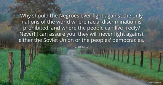 Robeson, Paul. (2026, January 16). Why should the Negroes ever fight against the only nations of the world where racial discrimination is prohibited, and where the people can live freely? Never! I can assure you, they will never fight against either the Soviet Union or the peoples' democracies. FixQuotes. https://fixquotes.com/quotes/why-should-the-negroes-ever-fight-against-the-94242/