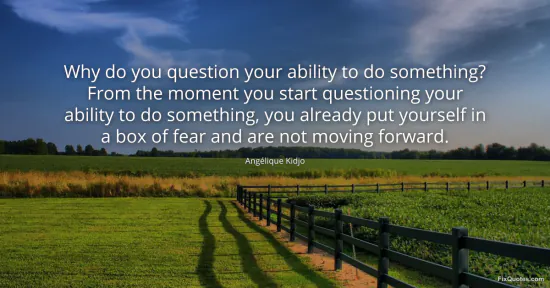 Kidjo, Angélique. (2026, February 16). Why do you question your ability to do something? From the moment you start questioning your ability to do something, you already put yourself in a box of fear and are not moving forward. FixQuotes. https://fixquotes.com/quotes/why-you-question-your-ability-to-do-something-185371/