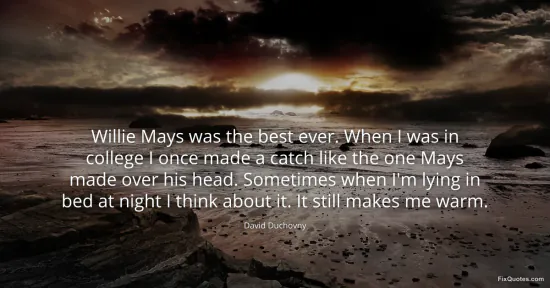 Duchovny, David. "Willie Mays was the best ever. When I was in college I once made a catch like the one Mays made over his head. Sometimes when I'm lying in bed at night I think about it. It still makes me warm." FixQuotes. January 17, 2026. https://fixquotes.com/quotes/willie-mays-was-the-best-ever-when-i-was-in-45613/.