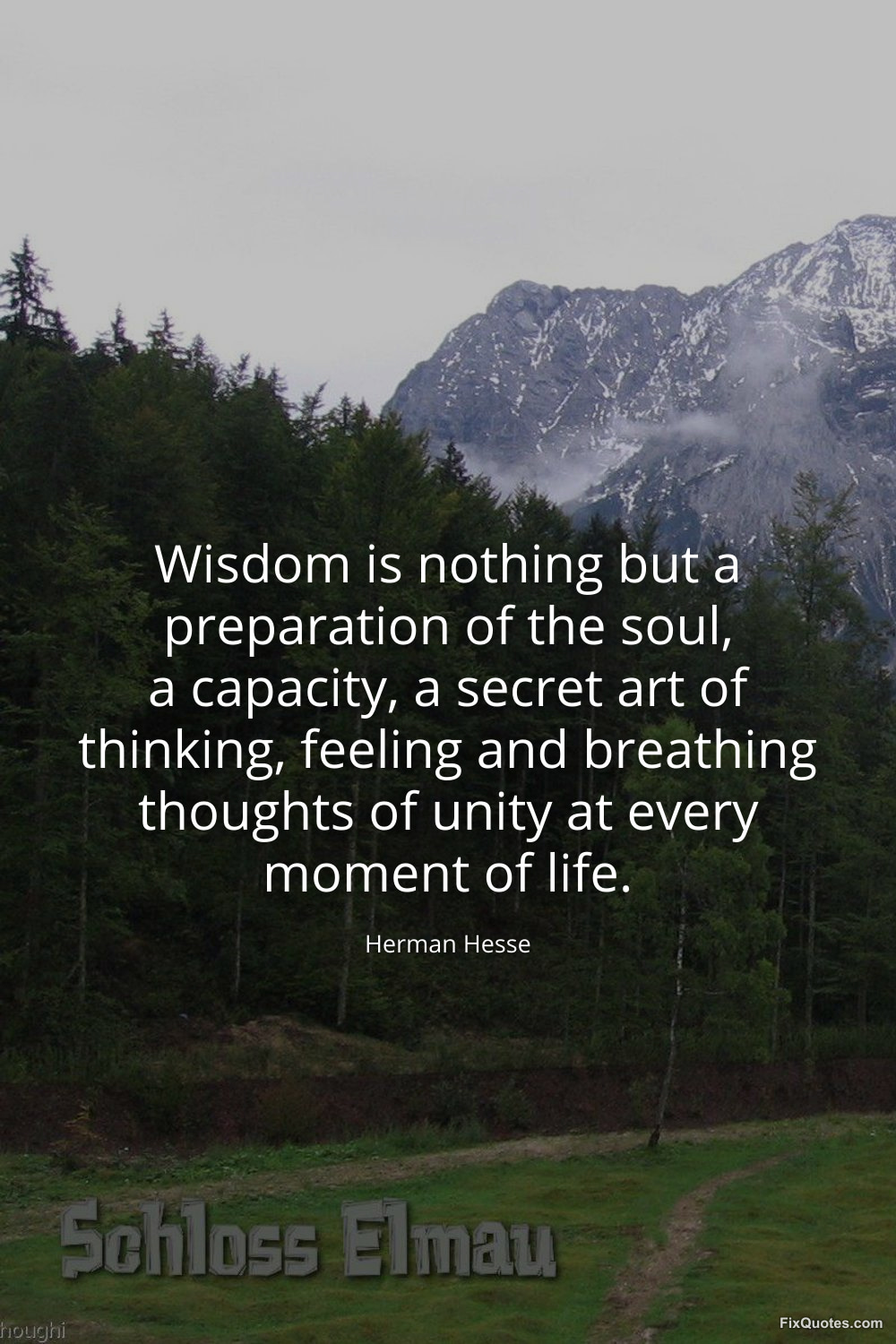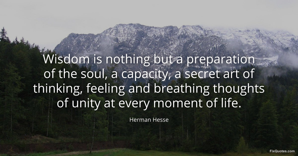 Hesse, Herman. (2026, January 17). Wisdom is nothing but a preparation of the soul, a capacity, a secret art of thinking, feeling and breathing thoughts of unity at every moment of life. FixQuotes. https://fixquotes.com/quotes/wisdom-is-nothing-but-a-preparation-of-the-soul-a-55042/