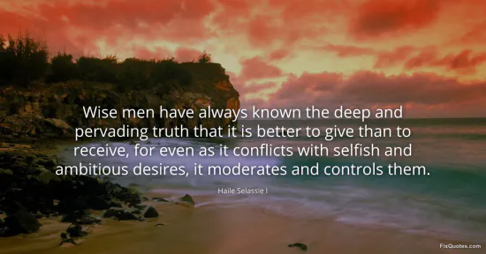 Selassie, Haile. "Wise men have always known the deep and pervading truth that it is better to give than to receive, for even as it conflicts with selfish and ambitious desires, it moderates and controls them." FixQuotes. March 14, 2026. https://fixquotes.com/quotes/wise-men-have-always-known-the-deep-and-pervading-186083/.
