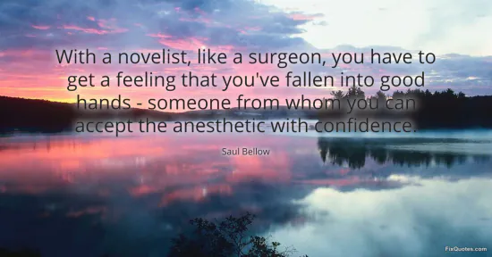 Bellow, Saul. "With a novelist, like a surgeon, you have to get a feeling that you've fallen into good hands - someone from whom you can accept the anesthetic with confidence." FixQuotes. January 18, 2026. https://fixquotes.com/quotes/with-a-novelist-like-a-surgeon-you-have-to-get-a-21150/.