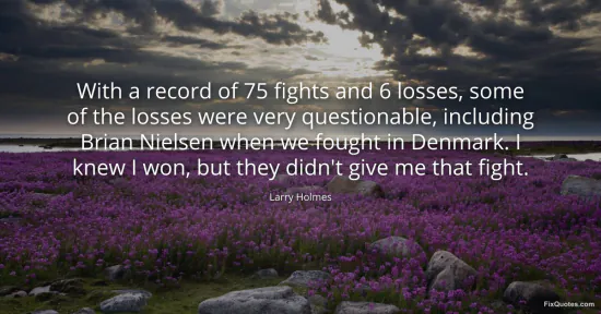 Holmes, Larry. "With a record of 75 fights and 6 losses, some of the losses were very questionable, including Brian Nielsen when we fought in Denmark. I knew I won, but they didn't give me that fight." FixQuotes. February 17, 2026. https://fixquotes.com/quotes/with-a-record-of-75-fights-and-6-losses-some-of-104618/.