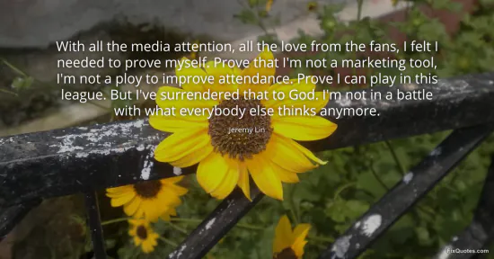 Lin, Jeremy. "With all the media attention, all the love from the fans, I felt I needed to prove myself. Prove that I'm not a marketing tool, I'm not a ploy to improve attendance. Prove I can play in this league. But I've surrendered that to God. I'm not in a battle with what everybody else thinks anymore." FixQuotes. January 18, 2026. https://fixquotes.com/quotes/with-all-the-media-attention-all-the-love-from-13530/.