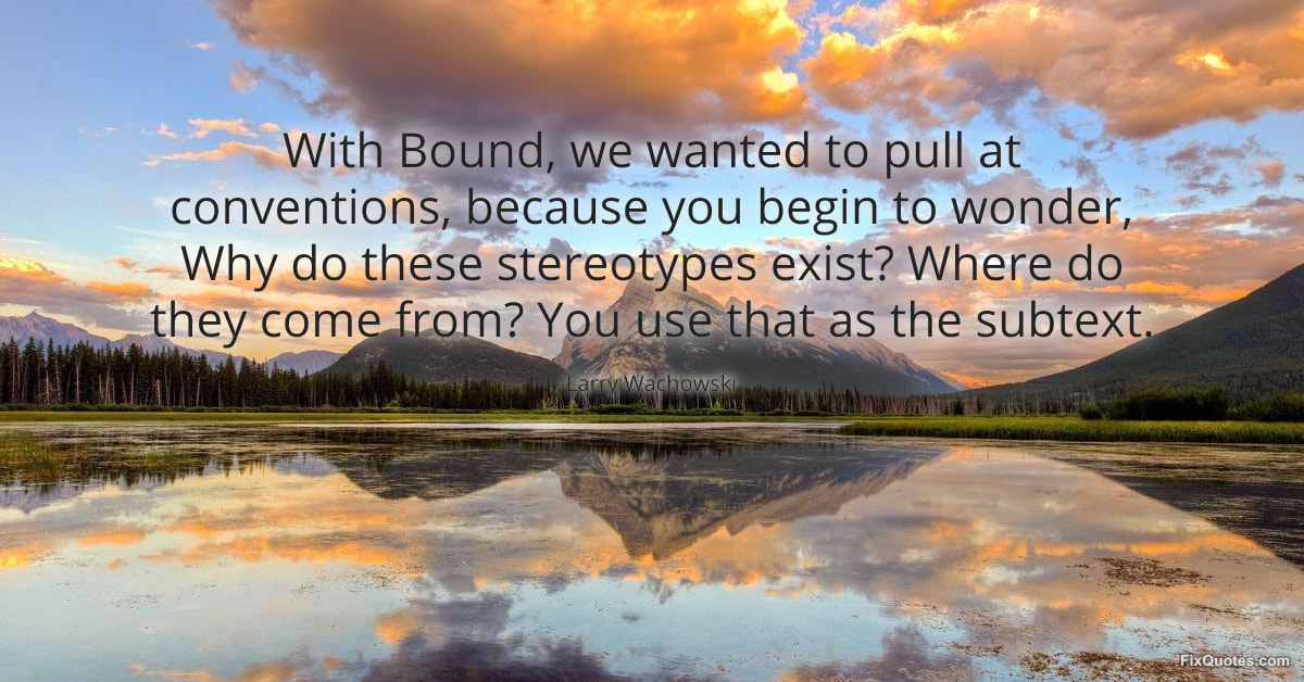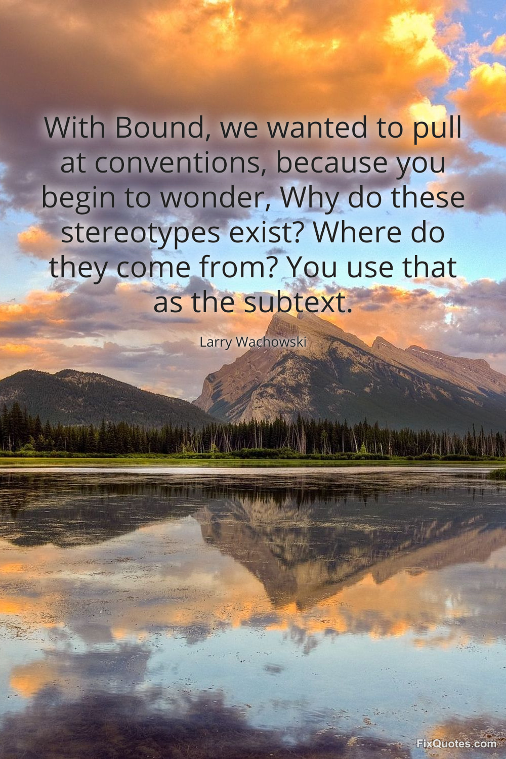 Wachowski, Larry. (2026, January 15). With Bound, we wanted to pull at conventions, because you begin to wonder, Why do these stereotypes exist? Where do they come from? You use that as the subtext. FixQuotes. https://fixquotes.com/quotes/with-bound-we-wanted-to-pull-at-conventions-146732/