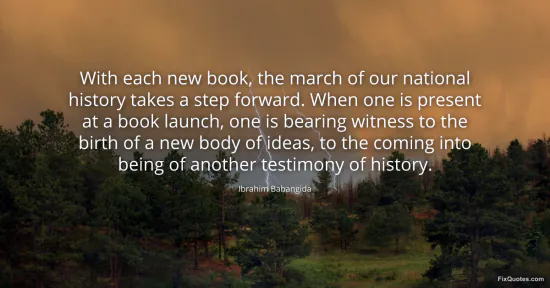 Babangida, Ibrahim. (2026, January 15). With each new book, the march of our national history takes a step forward. When one is present at a book launch, one is bearing witness to the birth of a new body of ideas, to the coming into being of another testimony of history. FixQuotes. https://fixquotes.com/quotes/with-each-new-book-the-march-of-our-national-153456/