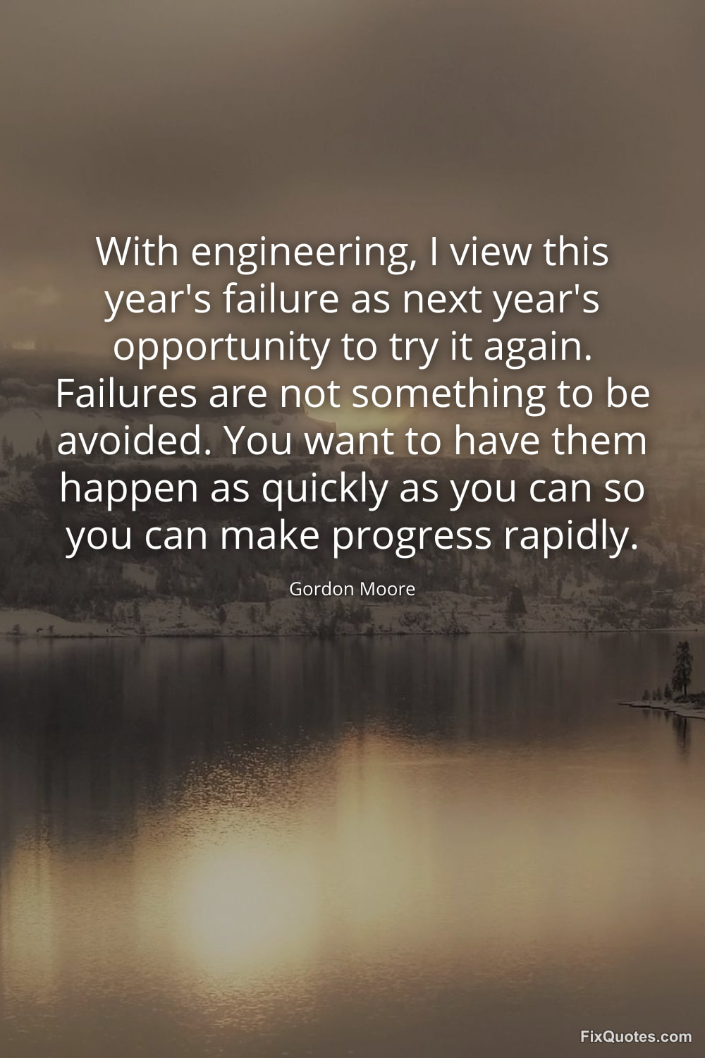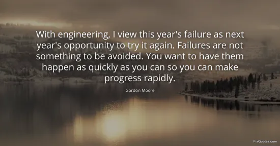 Moore, Gordon. "With engineering, I view this year's failure as next year's opportunity to try it again. Failures are not something to be avoided. You want to have them happen as quickly as you can so you can make progress rapidly." FixQuotes. January 17, 2026. https://fixquotes.com/quotes/with-engineering-i-view-this-years-failure-as-47752/.
