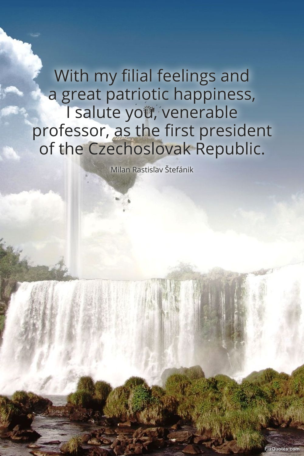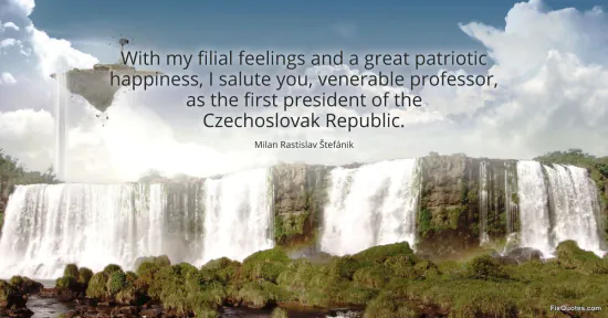 Stefanik, Milan Rastislav. "With my filial feelings and a great patriotic happiness, I salute you, venerable professor, as the first president of the Czechoslovak Republic." FixQuotes. March 14, 2026. https://fixquotes.com/quotes/with-my-filial-feelings-and-a-great-patriotic-186074/.