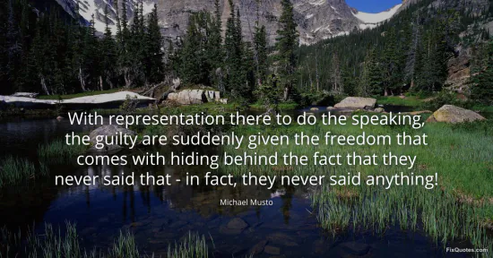 Musto, Michael. "With representation there to do the speaking, the guilty are suddenly given the freedom that comes with hiding behind the fact that they never said that - in fact, they never said anything!" FixQuotes. January 15, 2026. https://fixquotes.com/quotes/with-representation-there-to-do-the-speaking-the-150996/.