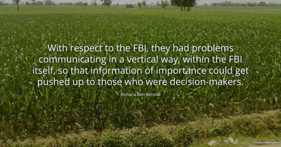 Ben-Veniste, Richard. "With respect to the FBI, they had problems communicating in a vertical way, within the FBI itself, so that information of importance could get pushed up to those who were decision-makers." FixQuotes. January 17, 2026. https://fixquotes.com/quotes/with-respect-to-the-fbi-they-had-problems-80555/.