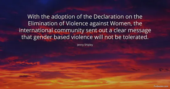 Shipley, Jenny. (2026, January 17). With the adoption of the Declaration on the Elimination of Violence against Women, the international community sent out a clear message that gender based violence will not be tolerated. FixQuotes. https://fixquotes.com/quotes/with-the-adoption-of-the-declaration-on-the-79520/