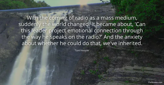 Hooper, Tom. (2026, January 18). With the coming of radio as a mass medium, suddenly the world changed. It became about, 'Can this leader project emotional connection through the way he speaks on the radio?' And the anxiety about whether he could do that, we've inherited. FixQuotes. https://fixquotes.com/quotes/with-the-coming-of-radio-as-a-mass-medium-17601/