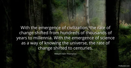 Thompson, William Irwin. "With the emergence of civilization, the rate of change shifted from hundreds of thousands of years to millennia. With the emergence of science as a way of knowing the universe, the rate of change shifted to centuries." FixQuotes. January 15, 2026. https://fixquotes.com/quotes/with-the-emergence-of-civilization-the-rate-of-154375/.