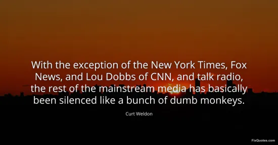Weldon, Curt. (2026, February 18). With the exception of the New York Times, Fox News, and Lou Dobbs of CNN, and talk radio, the rest of the mainstream media has basically been silenced like a bunch of dumb monkeys. FixQuotes. https://fixquotes.com/quotes/with-the-exception-of-the-new-york-times-fox-news-67076/