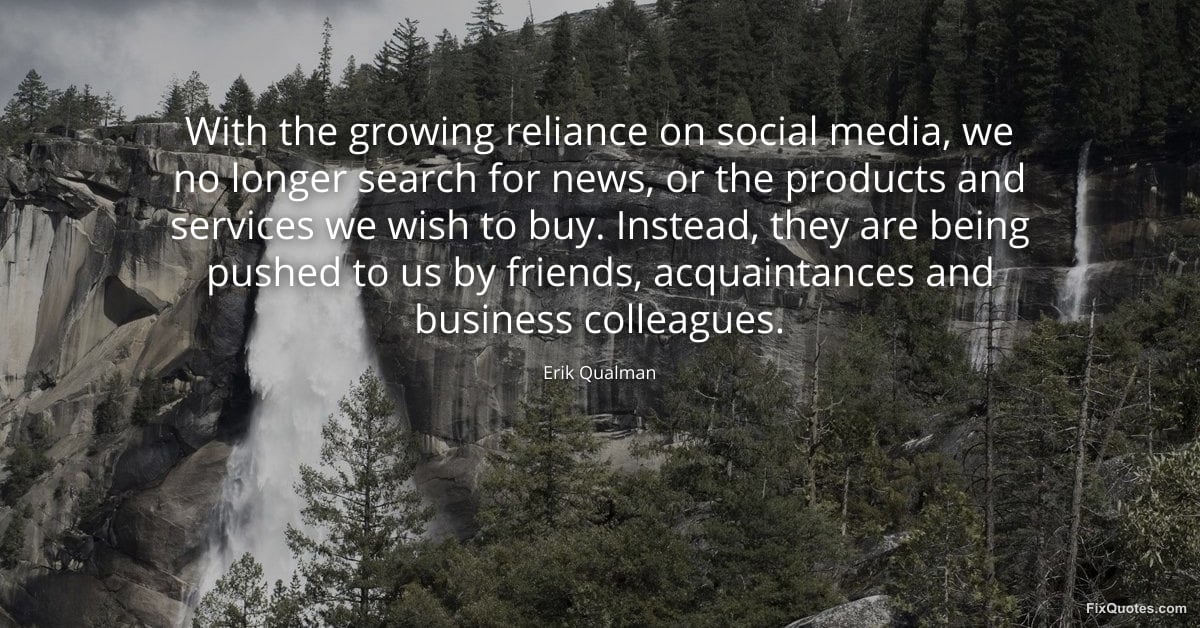 Qualman, Erik. "With the growing reliance on social media, we no longer search for news, or the products and services we wish to buy. Instead, they are being pushed to us by friends, acquaintances and business colleagues." FixQuotes. February 18, 2026. https://fixquotes.com/quotes/with-the-growing-reliance-on-social-media-we-no-73087/.