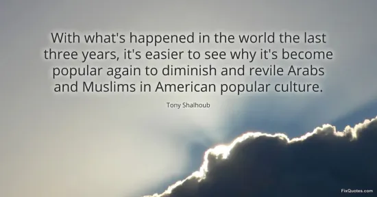 Shalhoub, Tony. "With what's happened in the world the last three years, it's easier to see why it's become popular again to diminish and revile Arabs and Muslims in American popular culture." FixQuotes. January 16, 2026. https://fixquotes.com/quotes/with-whats-happened-in-the-world-the-last-three-102729/.