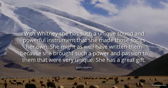 Guarini, Justin. (2026, January 16). With Whitney she has such a unique sound and powerful instrument that she made those songs her own. She might as well have written them because she brought such a power and passion to them that were very unique. She has a great gift. FixQuotes. https://fixquotes.com/quotes/with-whitney-she-has-such-a-unique-sound-and-113763/
