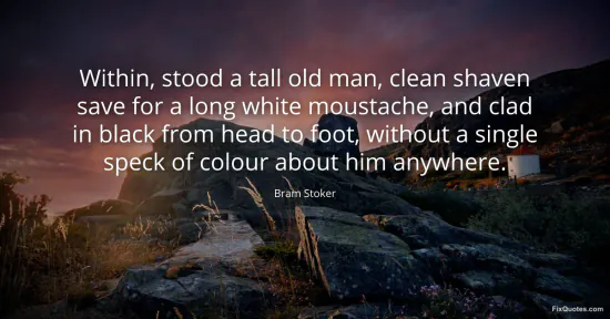 Stoker, Bram. "Within, stood a tall old man, clean shaven save for a long white moustache, and clad in black from head to foot, without a single speck of colour about him anywhere." FixQuotes. January 16, 2026. https://fixquotes.com/quotes/within-stood-a-tall-old-man-clean-shaven-save-for-139347/.