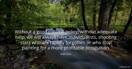 Allen, Ralph. "Without a good cultural policy, without adequate help, we will always have individualists, shooting stars who are rapidly forgotten or who stop painting for a more profitable occupation." FixQuotes. January 16, 2026. https://fixquotes.com/quotes/without-a-good-cultural-policy-without-adequate-122709/.