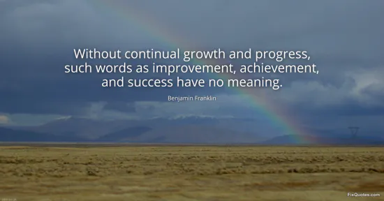 Franklin, Benjamin. (2026, January 17). Without continual growth and progress, such words as improvement, achievement, and success have no meaning. FixQuotes. https://fixquotes.com/quotes/without-continual-growth-and-progress-such-words-25556/