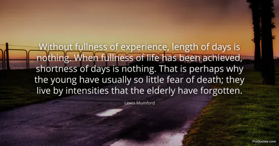 Mumford, Lewis. (2026, January 18). Without fullness of experience, length of days is nothing. When fullness of life has been achieved, shortness of days is nothing. That is perhaps why the young have usually so little fear of death; they live by intensities that the elderly have forgotten. FixQuotes. https://fixquotes.com/quotes/without-fullness-of-experience-length-of-days-is-21585/