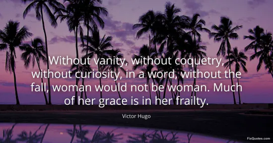 Hugo, Victor. (2026, January 15). Without vanity, without coquetry, without curiosity, in a word, without the fall, woman would not be woman. Much of her grace is in her frailty. FixQuotes. https://fixquotes.com/quotes/without-vanity-without-coquetry-without-curiosity-10587/