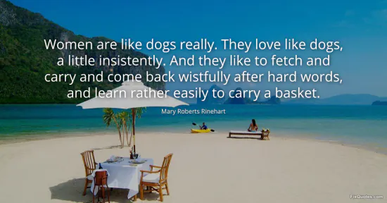 Rinehart, Mary Roberts. (2026, January 14). Women are like dogs really. They love like dogs, a little insistently. And they like to fetch and carry and come back wistfully after hard words, and learn rather easily to carry a basket. FixQuotes. https://fixquotes.com/quotes/women-are-like-dogs-really-they-love-like-dogs-a-108162/