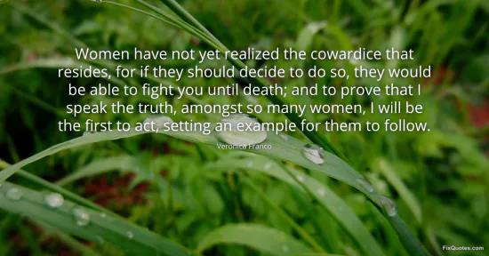 Franco, Veronica. (2026, January 16). Women have not yet realized the cowardice that resides, for if they should decide to do so, they would be able to fight you until death; and to prove that I speak the truth, amongst so many women, I will be the first to act, setting an example for them to follow. FixQuotes. https://fixquotes.com/quotes/women-have-not-yet-realized-the-cowardice-that-107870/