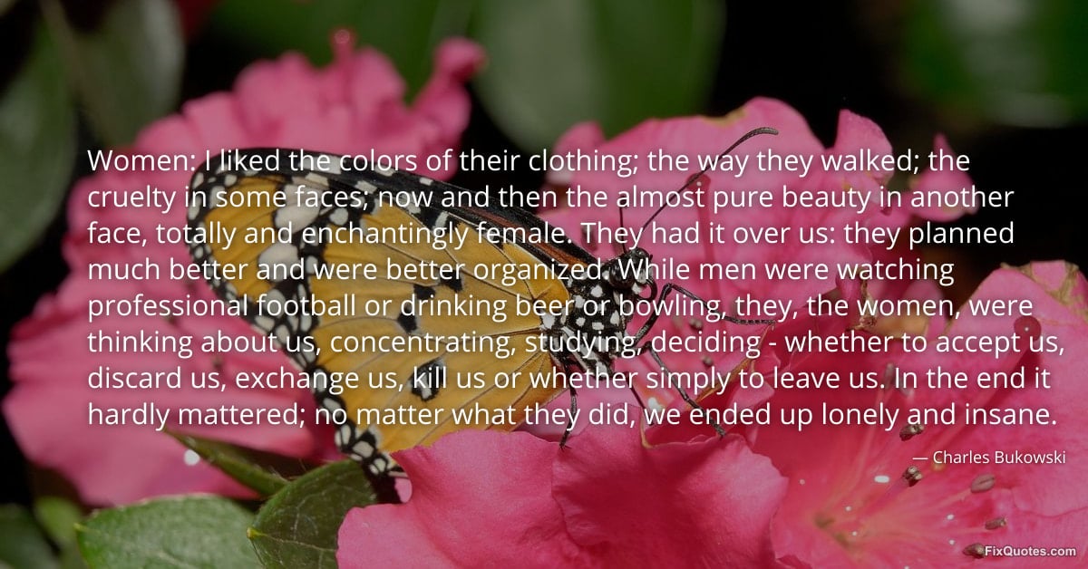 Bukowski, Charles. "Women: I liked the colors of their clothing; the way they walked; the cruelty in some faces; now and then the almost pure beauty in another face, totally and enchantingly female. They had it over us: they planned much better and were better organized. While men were watching professional football or drinking beer or bowling, they, the women, were thinking about us, concentrating, studying, deciding - whether to accept us, discard us, exchange us, kill us or whether simply to leave us. In the end it hardly mattered; no matter what they did, we ended up lonely and insane." FixQuotes. February 10, 2026. https://fixquotes.com/quotes/women-i-liked-the-colors-of-their-clothing-the-185209/.
