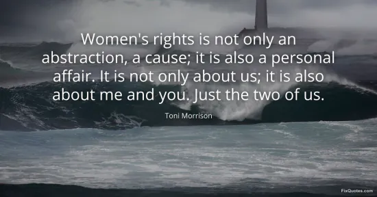 Morrison, Toni. (2026, January 17). Women's rights is not only an abstraction, a cause; it is also a personal affair. It is not only about us; it is also about me and you. Just the two of us. FixQuotes. https://fixquotes.com/quotes/womens-rights-is-not-only-an-abstraction-a-cause-74360/