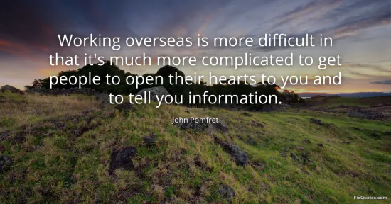 Pomfret, John. (2026, January 15). Working overseas is more difficult in that it's much more complicated to get people to open their hearts to you and to tell you information. FixQuotes. https://fixquotes.com/quotes/working-overseas-is-more-difficult-in-that-its-151832/