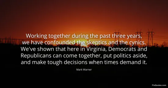 Warner, Mark. "Working together during the past three years, we have confounded the skeptics and the cynics. We've shown that here in Virginia, Democrats and Republicans can come together, put politics aside, and make tough decisions when times demand it." FixQuotes. January 16, 2026. https://fixquotes.com/quotes/working-together-during-the-past-three-years-we-134154/.