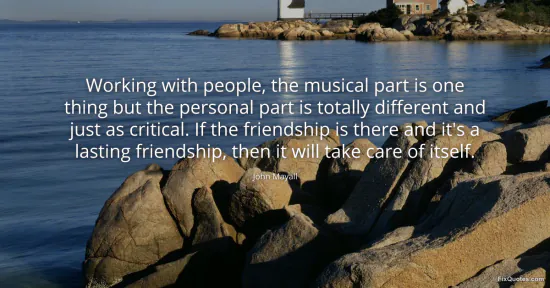 Mayall, John. "Working with people, the musical part is one thing but the personal part is totally different and just as critical. If the friendship is there and it's a lasting friendship, then it will take care of itself." FixQuotes. January 15, 2026. https://fixquotes.com/quotes/working-with-people-the-musical-part-is-one-thing-160553/.