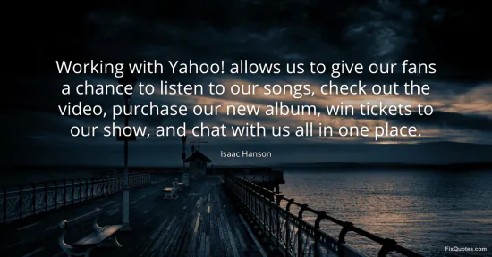 Hanson, Isaac. "Working with Yahoo! allows us to give our fans a chance to listen to our songs, check out the video, purchase our new album, win tickets to our show, and chat with us all in one place." FixQuotes. January 17, 2026. https://fixquotes.com/quotes/working-with-yahoo-allows-us-to-give-our-fans-a-56199/.