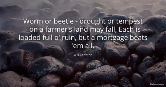 Carleton, Will. "Worm or beetle - drought or tempest - on a farmer's land may fall, Each is loaded full o' ruin, but a mortgage beats 'em all." FixQuotes. January 15, 2026. https://fixquotes.com/quotes/worm-or-beetle-drought-or-tempest-on-a-168683/.