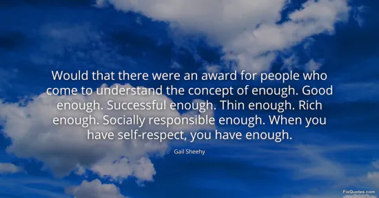 Sheehy, Gail. (2026, January 16). Would that there were an award for people who come to understand the concept of enough. Good enough. Successful enough. Thin enough. Rich enough. Socially responsible enough. When you have self-respect, you have enough. FixQuotes. https://fixquotes.com/quotes/would-that-there-were-an-award-for-people-who-90835/