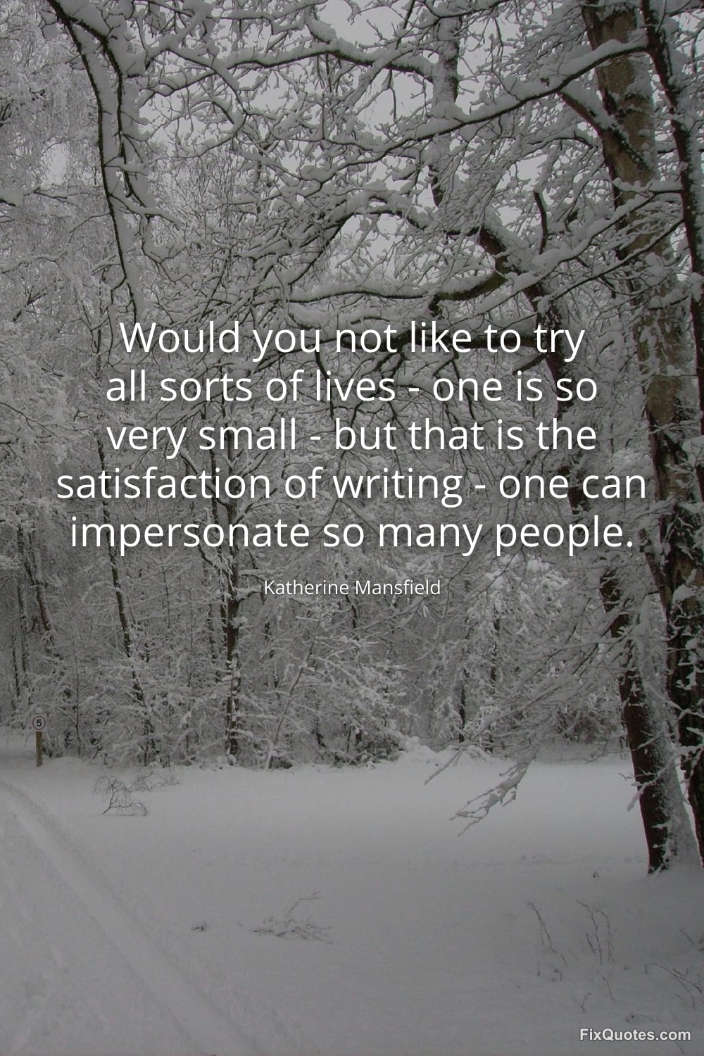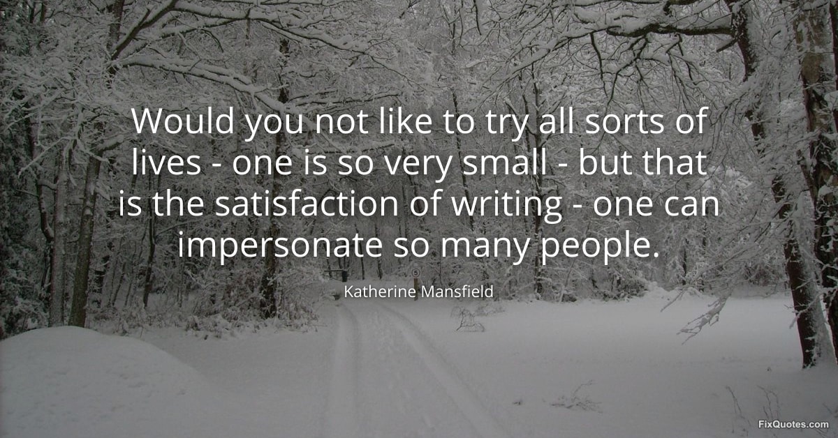 Mansfield, Katherine. "Would you not like to try all sorts of lives - one is so very small - but that is the satisfaction of writing - one can impersonate so many people." FixQuotes. January 16, 2026. https://fixquotes.com/quotes/would-you-not-like-to-try-all-sorts-of-lives-103416/.