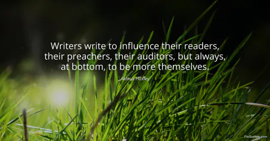 Huxley, Aldous. (2026, January 18). Writers write to influence their readers, their preachers, their auditors, but always, at bottom, to be more themselves. FixQuotes. https://fixquotes.com/quotes/writers-write-to-influence-their-readers-their-3140/