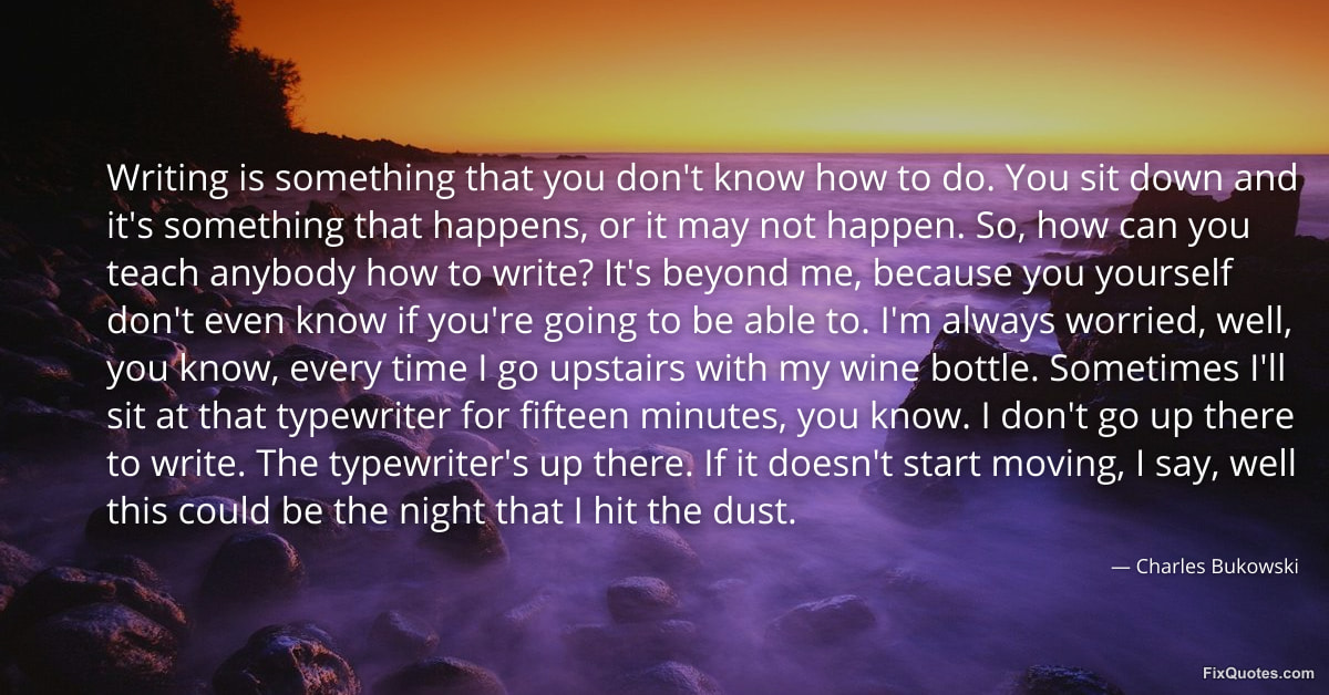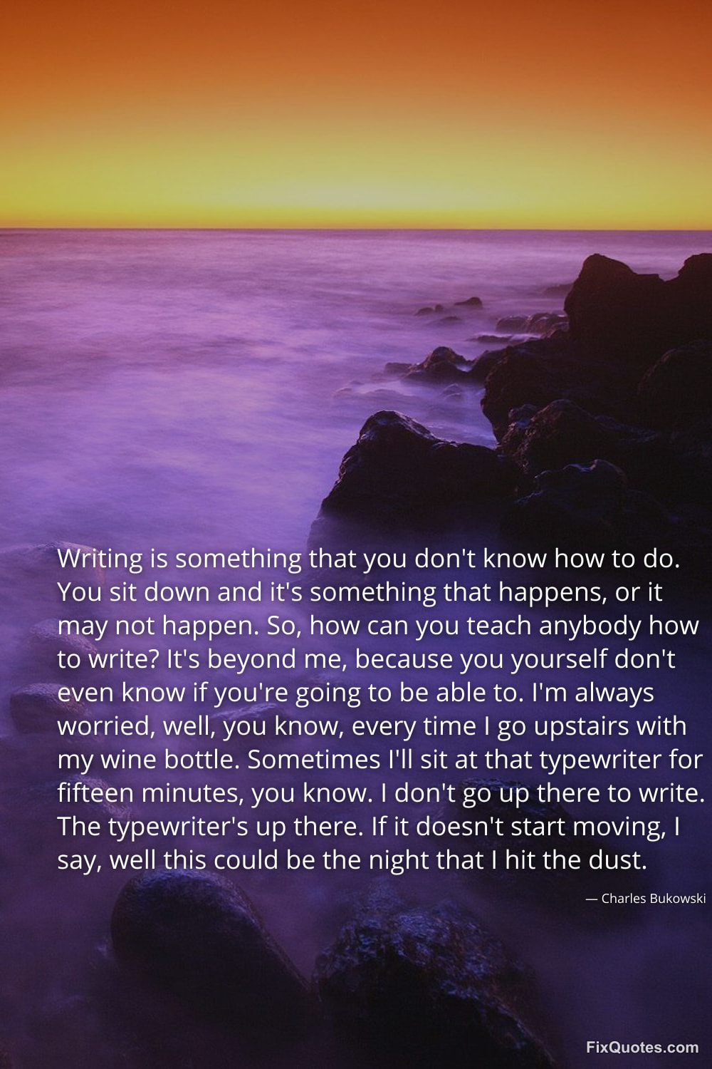 Bukowski, Charles. "Writing is something that you don't know how to do. You sit down and it's something that happens, or it may not happen. So, how can you teach anybody how to write? It's beyond me, because you yourself don't even know if you're going to be able to. I'm always worried, well, you know, every time I go upstairs with my wine bottle. Sometimes I'll sit at that typewriter for fifteen minutes, you know. I don't go up there to write. The typewriter's up there. If it doesn't start moving, I say, well this could be the night that I hit the dust." FixQuotes. February 10, 2026. https://fixquotes.com/quotes/writing-is-something-that-you-dont-know-how-to-do-185226/.