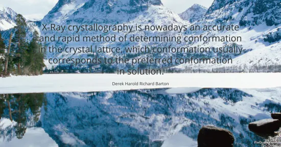 Barton, Derek Harold Richard. "X-Ray crystallography is nowadays an accurate and rapid method of determining conformation in the crystal lattice, which conformation usually corresponds to the preferred conformation in solution." FixQuotes. January 17, 2026. https://fixquotes.com/quotes/x-ray-crystallography-is-nowadays-an-accurate-and-57894/.