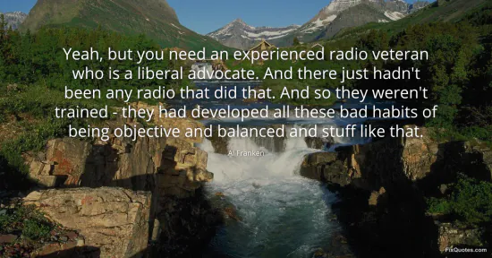 Franken, Al. "Yeah, but you need an experienced radio veteran who is a liberal advocate. And there just hadn't been any radio that did that. And so they weren't trained - they had developed all these bad habits of being objective and balanced and stuff like that." FixQuotes. January 18, 2026. https://fixquotes.com/quotes/yeah-but-you-need-an-experienced-radio-veteran-16361/.
