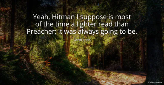 Ennis, Garth. "Yeah, Hitman I suppose is most of the time a lighter read than Preacher; it was always going to be." FixQuotes. January 15, 2026. https://fixquotes.com/quotes/yeah-hitman-i-suppose-is-most-of-the-time-a-94494/.