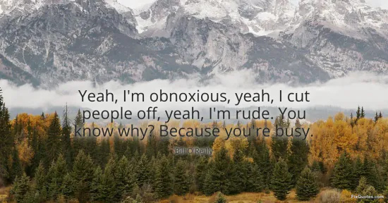 O'Reilly, Bill. (2026, January 17). Yeah, I'm obnoxious, yeah, I cut people off, yeah, I'm rude. You know why? Because you're busy. FixQuotes. https://fixquotes.com/quotes/yeah-im-obnoxious-yeah-i-cut-people-off-yeah-im-56562/