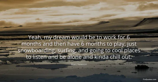 Newson, Marc. "Yeah, my dream would be to work for 6 months and then have 6 months to play, just snowboarding, surfing, and going to cool places to listen and be alone and kinda chill out." FixQuotes. January 16, 2026. https://fixquotes.com/quotes/yeah-my-dream-would-be-to-work-for-6-months-and-88456/.