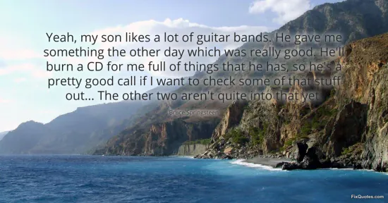 Springsteen, Bruce. "Yeah, my son likes a lot of guitar bands. He gave me something the other day which was really good. He'll burn a CD for me full of things that he has, so he's a pretty good call if I want to check some of that stuff out... The other two aren't quite into that yet." FixQuotes. January 17, 2026. https://fixquotes.com/quotes/yeah-my-son-likes-a-lot-of-guitar-bands-he-gave-50399/.