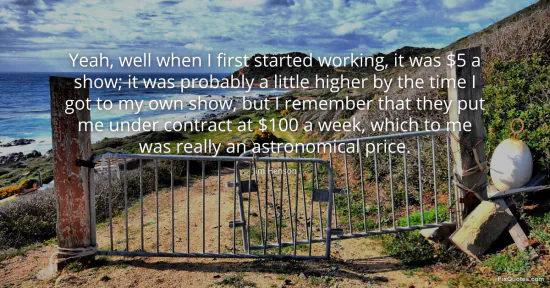 "Yeah, well when I first started working, it was $5 a show; it was probably a little higher by the time I got to my own show, but I remember that they put me under contract at $100 a week, which to me was really an astronomical price." FixQuotes, 16 Jan. 2026, https://fixquotes.com/quotes/yeah-well-when-i-first-started-working-it-was-5-a-83664/. Accessed 12 Feb. 2026.