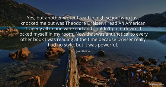 Didion, Joan. (2026, January 15). Yes, but another writer I read in high school who just knocked me out was Theodore Dreiser. I read An American Tragedy all in one weekend and couldn't put it down - I locked myself in my room. Now that was antithetical to every other book I was reading at the time because Dreiser really had no style, but it was powerful. FixQuotes. https://fixquotes.com/quotes/yes-but-another-writer-i-read-in-high-school-who-142958/