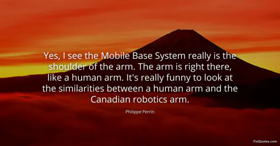 Perrin, Philippe. "Yes, I see the Mobile Base System really is the shoulder of the arm. The arm is right there, like a human arm. It's really funny to look at the similarities between a human arm and the Canadian robotics arm." FixQuotes. January 17, 2026. https://fixquotes.com/quotes/yes-i-see-the-mobile-base-system-really-is-the-76245/.